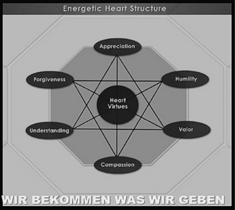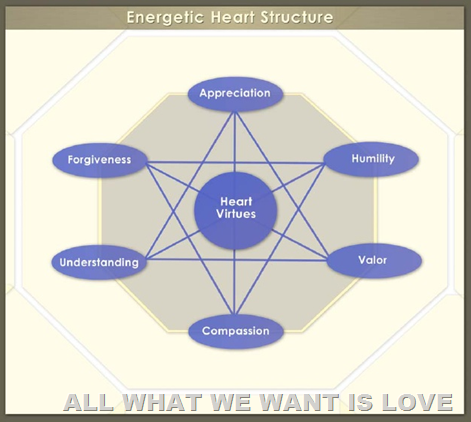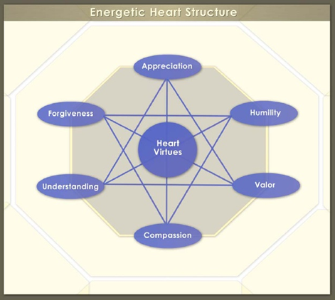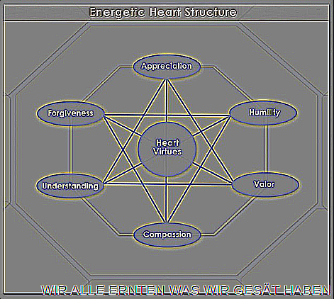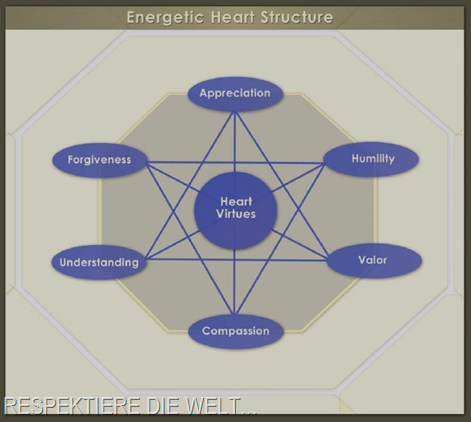 Das energetische Herz 1) ist die Quelle von Tugenden, die mit Bezeichnungen wie Mitgefühl und Anerkennung verbunden sind. Das sind äußerliche Bezeichnungen der mächtigen Frequenzen des Herzens, welche die Essenz einer Person definieren. Die Tugenden des Herzens sind die energetischen Quellen, sowohl der Wahrnehmung als auch des Ausdrucks der unsterblichen Seele, die die menschliche Persönlichkeit innerhalb der Welt der Formen bewohnt.