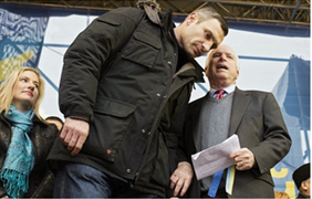 Vereint mit Witalij Klitschkos “Udar” und der Allukrainischen Vereinigung “Vaterland”, der inzwischen nicht mehr inhaftierten Ex-Ministerpräsidentin Julia Timoschenko, ist Swoboda im westlichen Auge, ein legitimer Teil der „demokratischen Opposition”. Swoboda bildet zudem das Verbindungsglied zu einer Reihe zwar kleinerer, aber weitaus radikalerer Neonazi-Gruppierungen, beispielsweise der paramilitärisch organisierten UNA-UNSO. Diese NeoFaschisten bilden den Großteil der Schlägertrupps, die sich Auseinandersetzungen mit den Polizeitruppen der ukrainischen Regierung lieferten.