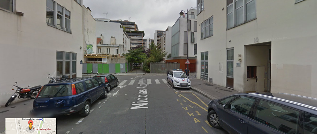 Es waren – mindestens – 3 verschiedene Operationen. Nr. 1, der direkte Anschlag auf die “Charlie Hebdo” Redaktion, in der Rue Nicolas-Appert 10. Zeitgleich lief Nr. 2, die Ermordung eines muslimischen Polizisten (Ahmed Merabet )ab, wo man uns verkaufte, es wäre direkt vor dem “Charlie Hebo” Gebäude passiert. Am Bild hier unterhalb, (Google Street View) sieht man den Eingang der Charlie Hebdo Redaktion, Rue Nicolas-Appert 10. Eine eher kleine Straße, wohingegen die Erschießung des Polizisten, mindestens 200 Meter weiter, am Richard Lenoir Boulevard passierte. Das sind eindeutig zwei verschiedene Tatorte.