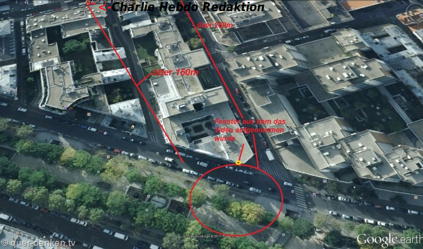 Danke an Michael Vogt von querdenken.tv, für seine ausgezeichnete Arbeit und wo er zu Recht fragte: “Auf dem Video unten steht das Fluchtfahrzeug mitten auf der Straße, hat also gerade erst angehalten. Es ist unwahrscheinlich, daß die Attentäter es dort abstellten, zu Fuß über 150 – 200 Meter zur Redaktion Charlie Hebdo liefen, dort das Attentat begingen, wieder 200 Meter zurückliefen, den Polizisten erschossen und dann ein anderes Auto entführten (sie nahmen einem Franzosen einen grauen Peugeot weg.) und dieses Fluchtfahrzeug samt Ausweispapieren einfach so stehen ließen. Irgendwie ist diese Szene vollkommen sinnlos.”