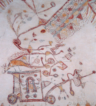 Innerhalb dieser Strukturen sind Wesen zu sehen, drei davon ohne Gesichtszüge. Der erste Eindruck: ein Ding aus einer anderen Welt. Ein Raumschiff? Jedenfalls muss die gezeigte Szene im Kosmos spielen, denn das Gebilde ist von einem Sternenmeer umgeben. Mond und Zentralgestirn sind ebenfalls abgebildet, wobei die Sonne mit Gesicht und fünf geschwungenen Beinchen auch die Schwester von E.T. sein könnte. Entdeckt wurden die außergewöhnlichen Fresken erst bei der Restaurierung im Jahre 1959.