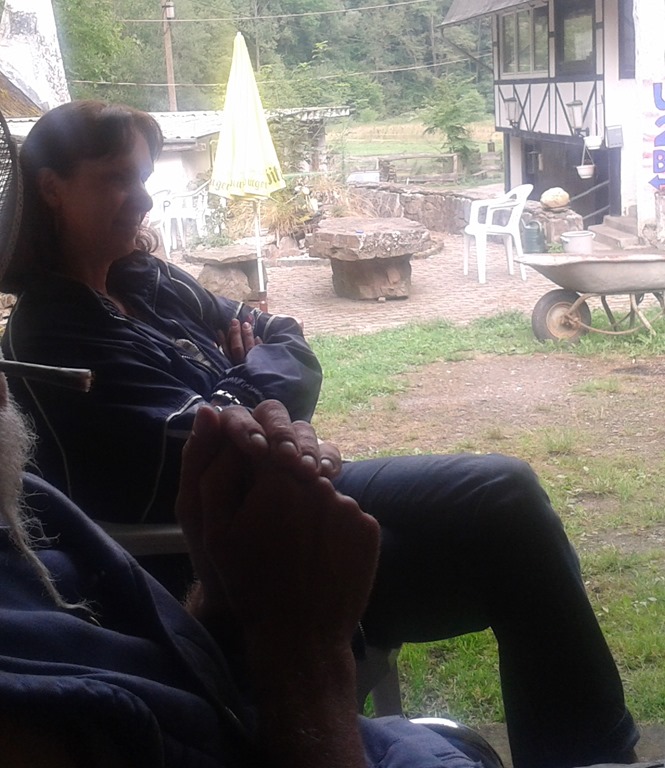 Wir sind ja meistens rumgesessen, haben viel gequatscht und ab und zu die “relative Örtlichkeit” gewechselt, sprich, von der kleinen “Terrasse” zum Grillplatz. Übrigens, wo eh kaum jemand Fleisch grillte – erstaunlicherweise, ganz im Gegensatz zu den ersten Jahren, wo ich ja selber auch noch Fleisch gegessen habe. Viele von uns haben Nachmittags allerdings ne Wanderung, durch die wirklich sehr schöne, fast idyllische Landschaft gemacht. Mich kriegte man dazu jedoch kaum, ja, ja, ich weiß, “böser Steven”, ich bin einfach viel zu FAUL dazu. Aber Petra konnte mich dann doch dazu breitschlagen, zumindest ein bisschen rumzulaufen – naja, mehr oder weniger.
